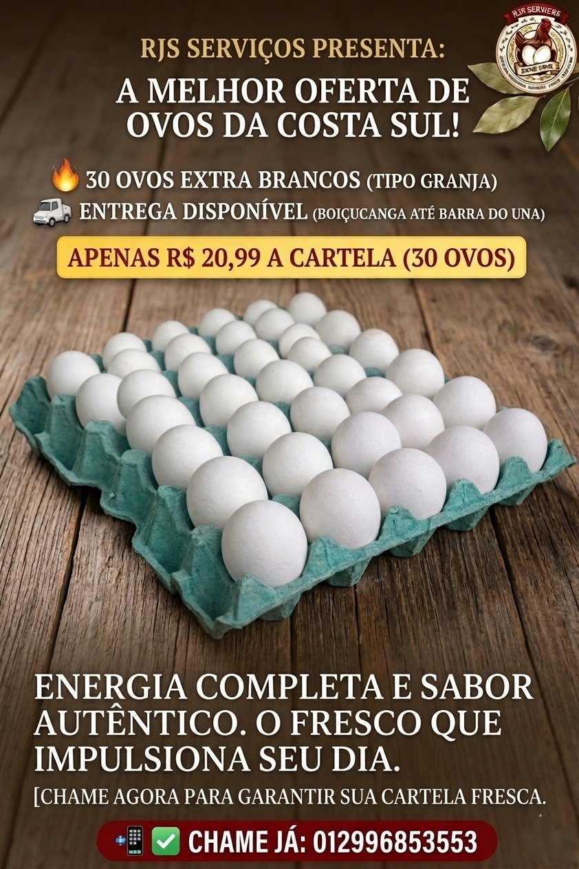 🥚 Ovos extra brancos, super frescos! 🛵 Delivery (Costa Sul): Boiçucanga a Barra do Una. 📦 Pedidos a partir de 3 cartelas.